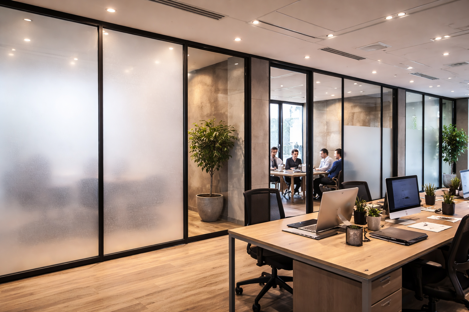 Enables glass partitions to transition between open and private zones, increasing spatial flexibility without altering the physical layout.